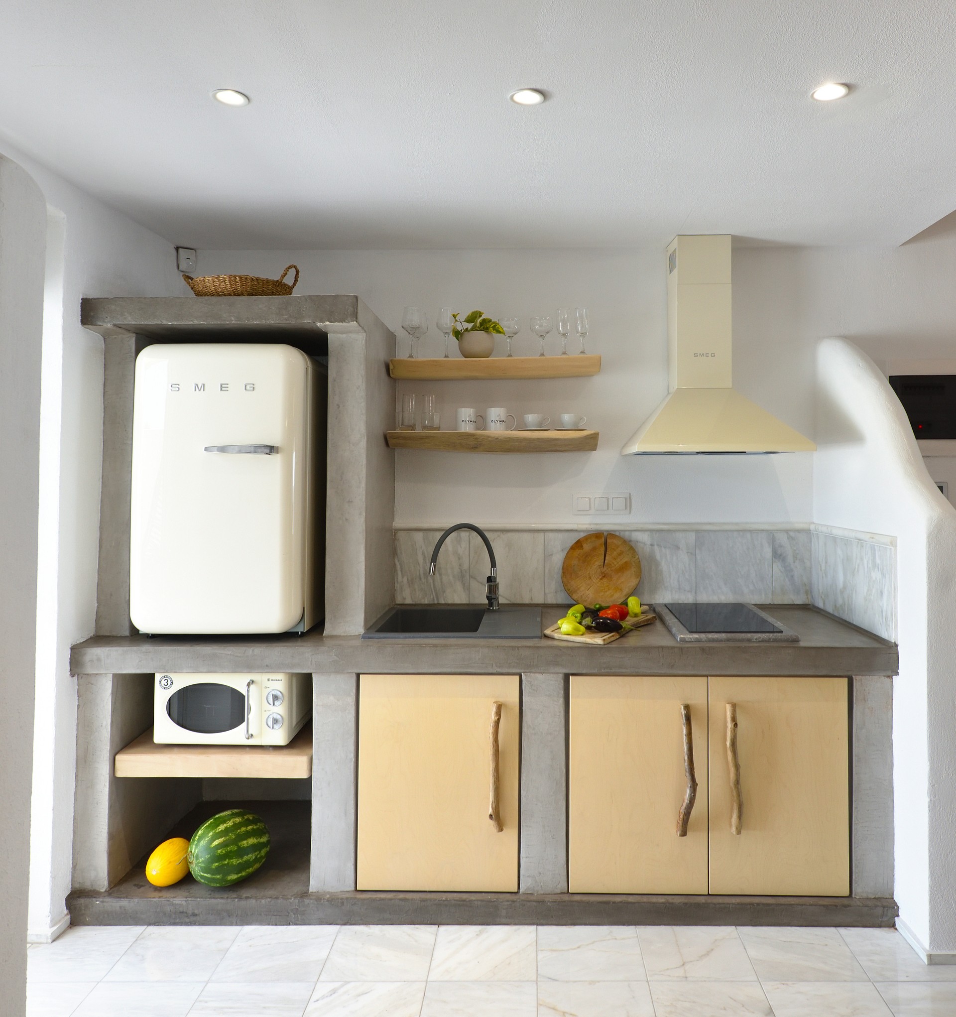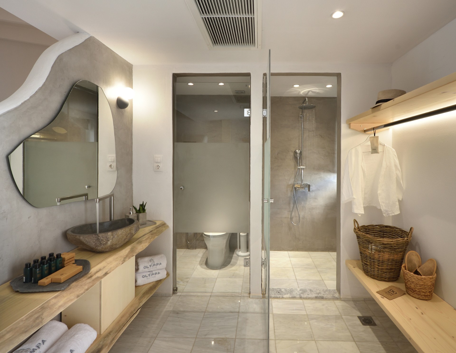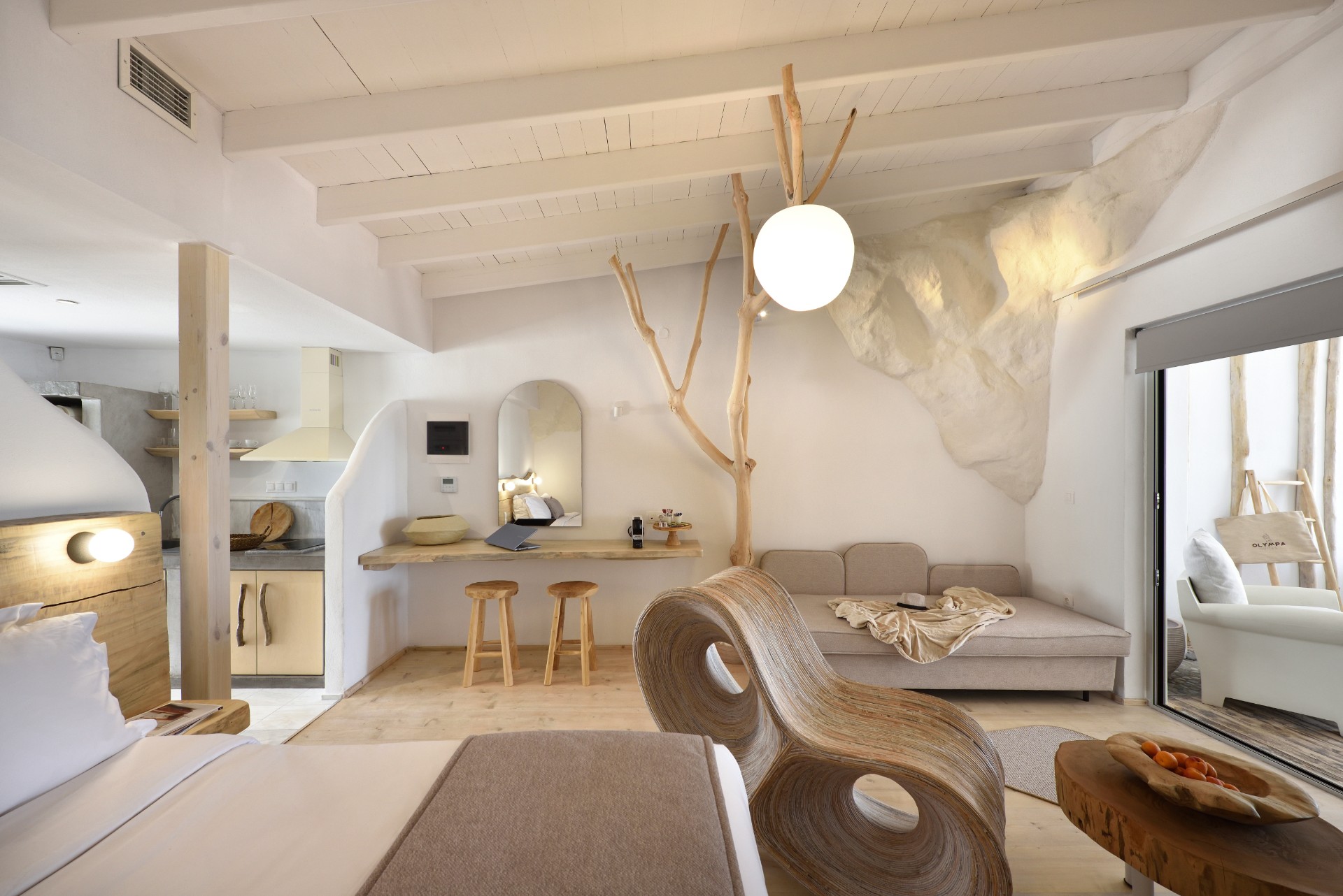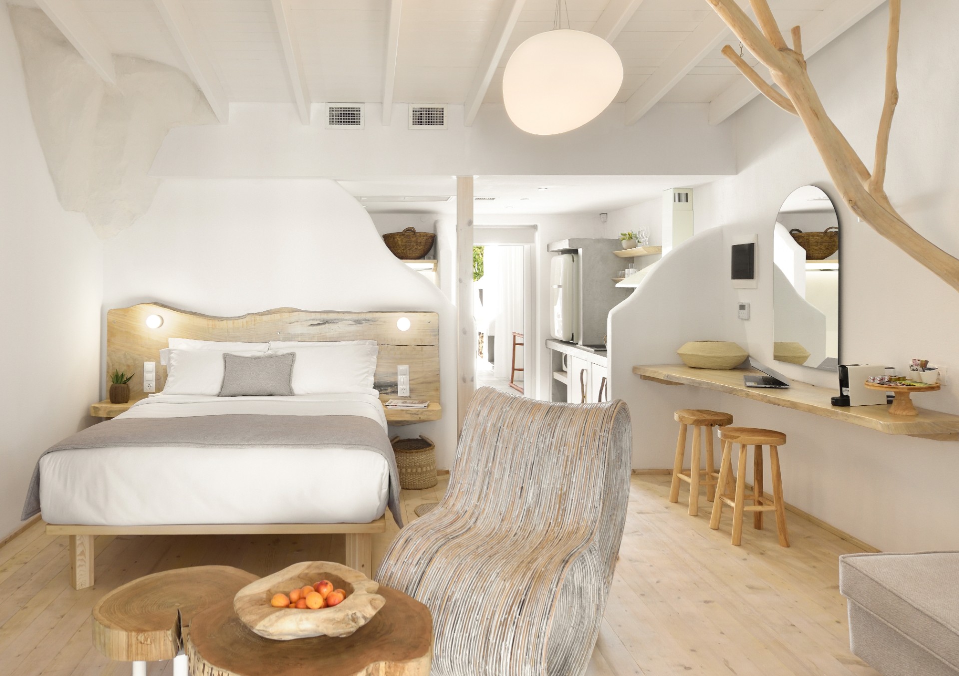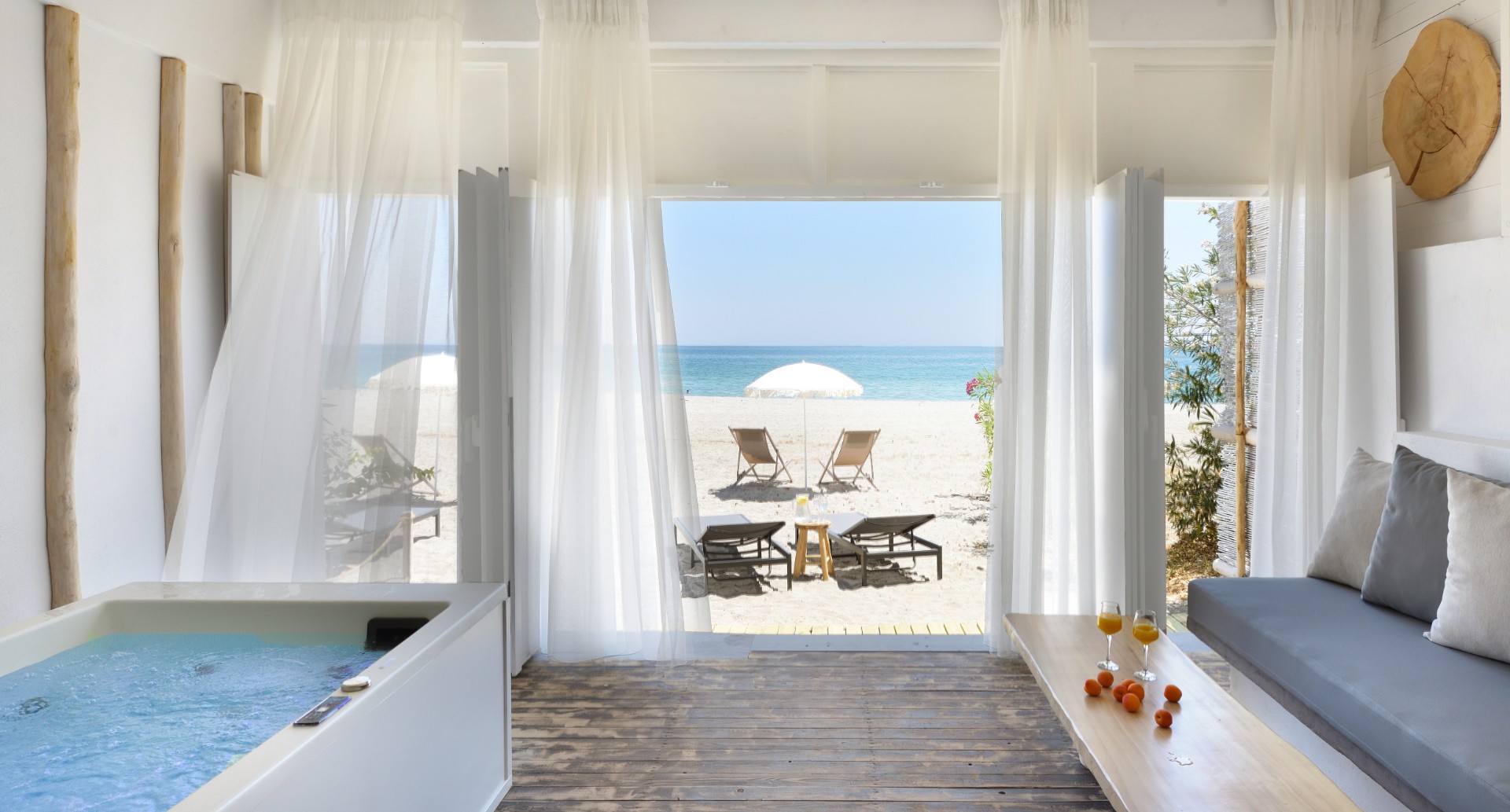 The Sea front suite offers refined comfort with a double bed, a fully equipped mini-kitchenette including a refrigerator, and a bathroom with premium natural care products. Amenities include a Nespresso coffee maker, complimentary Wi-Fi, air conditioning, a safe box, and a private mini-spa jacuzzi for an enhanced relaxation experience and a courtyard with a barbecue.