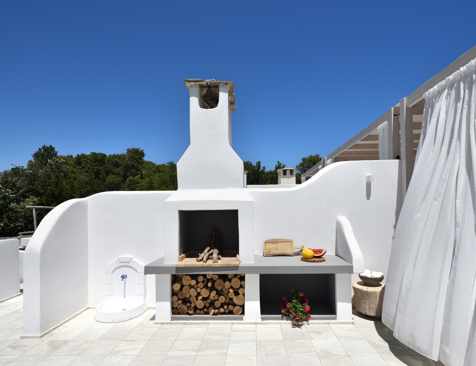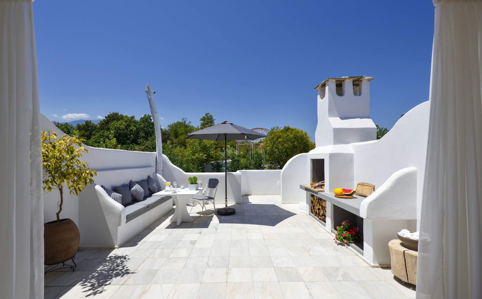 Spacious marble courtyard with BBQ, sitting area, hammock and umbrella.